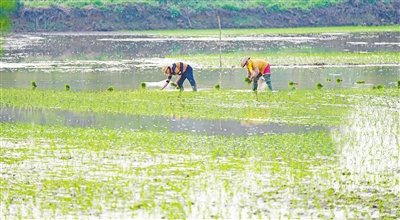 三月二日,海口市秀英区石山镇的农户在水田里插秧。海南日报记者 陈元才 摄