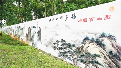 在大山村口,一幅长达150米的中国百山图跃然于墙面之上,雄伟壮阔的祖国风光徐徐展开——
