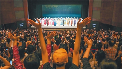 3月5日,在海南省歌舞剧院,舞蹈诗剧《只此青绿》受热捧,演职人员连续谢幕3次后,观众仍然不舍离去。