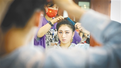 3月3日,演出前,曾小玲在化妆间上妆。