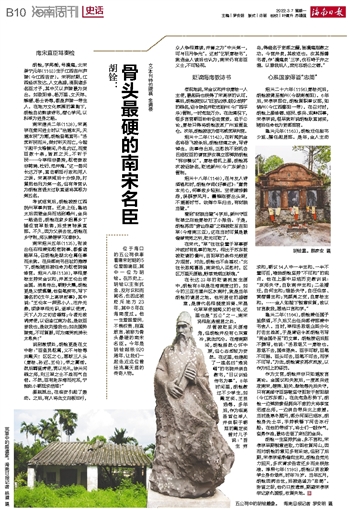 文\本刊特约撰稿 金满楼位于海口的五公祠供奉着唐宋时期的5位爱国谪臣,其中一位为胡铨。在历史上,胡铨以主张抗金、反对议和而闻名,也因此被贬斥地方23年,其中8年在海南度过。他一生爱国爱民,不畏权贵,刚直敢言,被称为骨头最硬的南宋名臣。今年是胡铨诞辰920周年,让我们一起走近这位曾经流寓天涯的传奇人物。