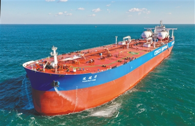 入籍“中国洋浦港”的全球首艘LNG双燃料超大型原油轮“远瑞洋”轮。 (中远海运能源运输股份有限公司供图)