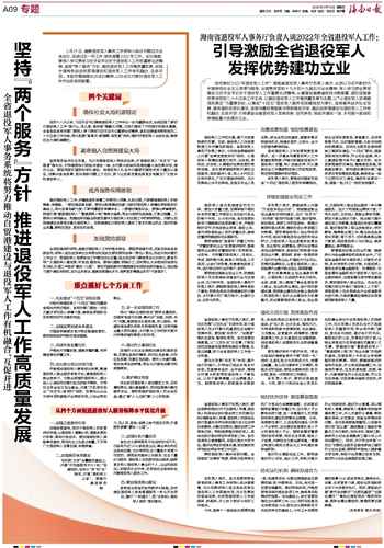 党的十八大以来,习近平总书记围绕退役军人工作作出一系列重要论述,系统回答了新时代退役军人工作“做什么、怎么做、谁来做”等重大问题,为我们提供了方向指引和根本遵循。全省各级各有关部门要深入学习贯彻习近平总书记重要论述精神,紧扣迎接宣传贯彻党的二十大这条工作主线,深化拓展“查堵点、破难题、促发展”活动,维护好退役军人合法权益,确保社会大局和谐稳定。