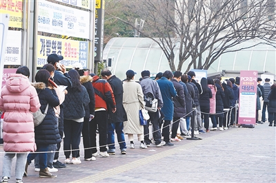 3月9日,人们在韩国首尔一处新冠检测点排队等待检测。