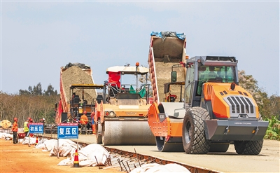日前,在国道G360文昌至临高公路项目临高段,压路机往返穿梭施工。