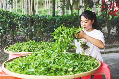 茶农翻动茶叶,为揉捻发酵做准备。