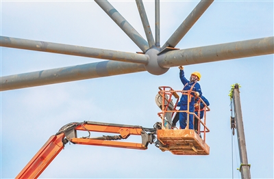 ②3月18日,在琼中体教融合产业发展(琼中女足)示范区项目建设现场,工人涂刷防锈漆。 本报记者 李天平 摄
