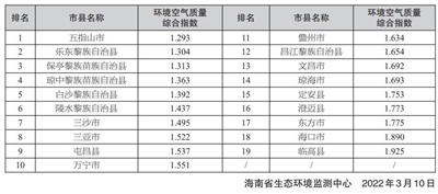 按照《环境空气质量标准》(GB3095-2012)及修改单、《环境空气质量评价技术规范(试行)》(HJ663-2013)和《城市环境空气质量排名技术规定》(环办监测〔2018〕19号)评价,2022年2月,全省环境空气质量优良天数比例为99.6%,其中,优级天数比例为92.2%,良级天数比例为7.4%,轻度污染天数比例为0.4%,无中度及以上污染天。环境空气质量排名靠前的市县分别是五指山市、乐东黎族自治县和保亭黎族苗族自治县,排名靠后的市县分别是临高县、海口市和东方市。2022年2月全省19个市县环境空气质量排名如右: