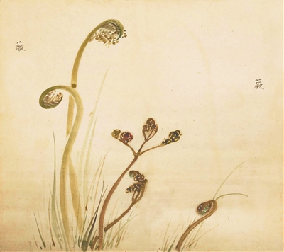 宋代陆游对蕨菜尤为喜爱,其饮食诗中时常提及蕨菜,如“蕨芽珍嫩压春蔬”“晨飧美蕨薇”“箭笋蕨芽如蜜甜”等,给了其很高的评价。明人罗永恭的《捣蕨歌》,真真是把一整个春天吃进了肚里:“堆盘炊熟紫玛瑙,入口嚼碎明琉璃。溶溶漾漾甘如饴,但觉馁腹回春熙。”清人袁枚在《随园食单》中详细地描述了蕨菜该如何品尝:“用蕨菜,不可爱惜,须尽去其枝叶,单取直根,洗净煨烂,再用鸡肉汤煨。必买关东者才肥。”