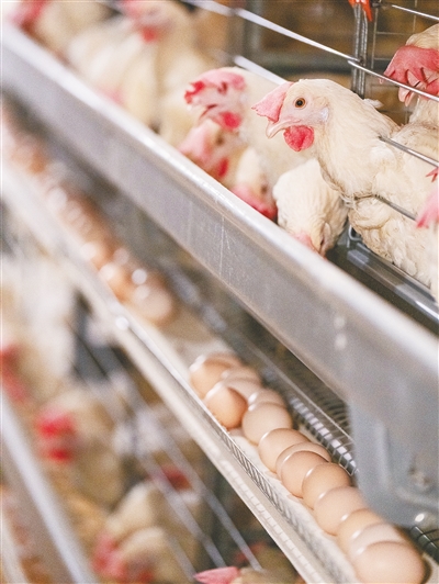 此外,为了提高鸡蛋的品质,海垦海津益佳牧业公司在项目运营前,聘请专家为蛋鸡制定专业“食谱”。此外,自动化养殖有助于企业更加严格地把控饲料的质量,通过管线系统的运行,饲料从混合、研磨、搅拌到投喂全程不落地。