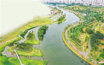 3月19日,无人机拍摄的海口美舍河凤翔湿地公园。新华社记者 郭程 摄
