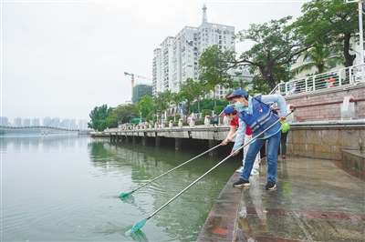 三月二十二日,志愿者在三亚河亲水平台上打捞水面垃圾。武昊供图