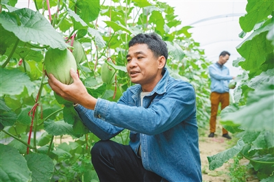 近日,乐东佛罗镇瓜农在查看哈密瓜生长情况。 本报记者 袁琛 实习生 张芷毓 图/文