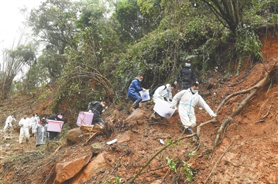 3月24日,藤县空难搜寻工作持续展开。搜救人员在广西梧州藤县事故核心区继续搜寻失事飞机的另一个飞行数据记录仪(黑匣子)和相关残骸。新华社记者 陆波岸 摄