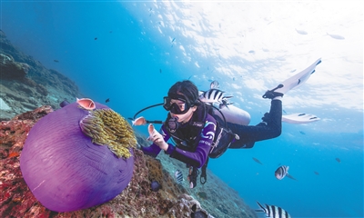 ■ 本报记者 李艳玫3月25日,当游客们来到三亚蜈支洲岛旅游区,换上潜水装备,暂别椰风海韵潜入蔚蓝海底,眼前展现一派生机勃勃的世界:红的、蓝的、黄的软体珊瑚正摇曳身姿,形态各异的鱼儿在自由自在游动……
