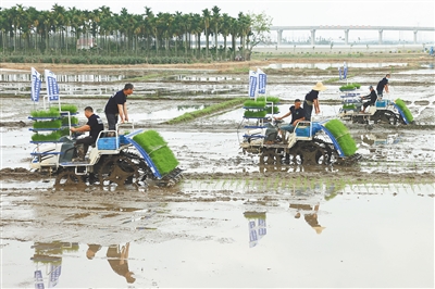 本报三亚3月26日电 (记者李梦楠)3月26日,三亚市崖州区万亩耕地稻菜轮作暨良种推广良法示范现场会在坝头南繁公共试验基地举行,当天集中示范插秧1223.9亩,通过发挥试验基地良种、良法种粮稳产示范带动作用,探索运用农业生产规模化机械化的形式,以多种轮作模式,解决农民种粮积极性不高、土地闲置撂荒等问题,助力实现农民增收、粮食增产提质、耕地增加增效。现场,伴随着插秧机隆隆的机器声,一条条均匀分布、深浅合适的稻苗被插入稻田。据悉,为充分利用南繁科研成果聚集优势,发挥国家现代农业产业园平台优势,崖州区政府在坝头南繁公共试验基地片区打造千亩高产水稻种植示范基地,集中展示优质品种种植、机械化育苗、机械化插秧、无人机植保、机械化采收等良法。目前该片区已完成水稻种植285.4亩,本次集中示范插秧1223.9亩。