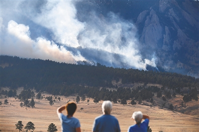 据外媒报道,美国科罗拉多州博尔德发生山火,有关部门向当地1.9万多名居民发布了疏散令。图为3月26日,人们在博尔德观察山火。