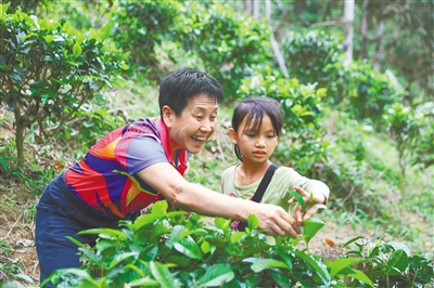 3月19日,在五指山市水满乡水满上村,王嘉嘉教关艳采茶。关艳收获很多新鲜体验。