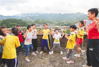 3月24日,在五指山市水满中心学校,训练后,关艳带孩子们放松玩耍。