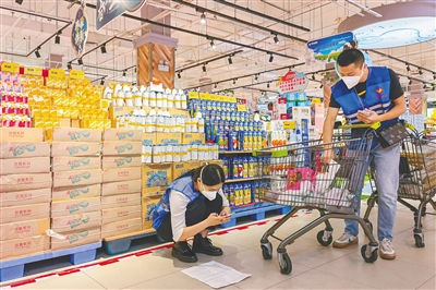 5日,志愿者在三亚一超市帮封控区域内居民购买生活物资。本报记者 武威 摄