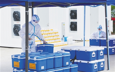 4月5日,在三亚市美丽之冠移动方舱核酸检测点,工作人员加急进行核酸样本预分检工作。作为三亚市区最大的移动检测点,目前该检测点共配备两套完整三区负压核酸检测实验室,工作人员实行24小时不间断核酸检测工作,单日最高检测量可达25322单管。本报记者 封烁 李艳玫 图/文
