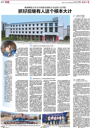 从“蜗居”在公共教学楼,到拥有面积达4800平方米的独栋大楼;从经费“捉襟见肘”到专任思政课教师每年奖补津贴人均2万元;从“平平无奇”到获国家社会科学基金重点项目资助、获批海南省唯一的“全国高校思政课名师工作室”项目……2019年7月以来,海南师范大学马克思主义学院坚持学习贯彻党的十九大和十九届历次全会精神,求真务实、改革创新,全力争创全国重点马克思主义学院,以狠抓思政课教育教学和人才培养为工作重点,以加强学科建设和科学研究为有力支撑,以强化师资队伍建设为关键任务,在党建工作、教育教学、科学研究、学科建设、社会服务等方面取得了明显成效,为落实立德树人根本任务,抓好后继有人这个根本大计筑牢了坚实的基础。