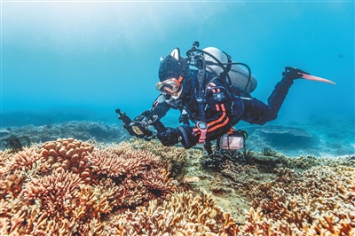 近日,在三亚蜈支洲岛附近海域,工作人员记录珊瑚礁修复生长情况。 本报记者 武威 通讯员 张路 图/文