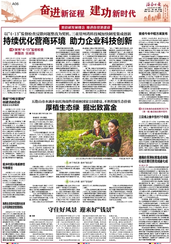海南热带雨林国家公园是海南生态环境的一块“金字招牌”,拥有我国分布最集中、保存最完好、连片面积最大的热带雨林。习近平总书记对海南生态环境保护寄予厚望,在“4·13”重要讲话中提出,海南要“积极开展国家公园体制试点,建设热带雨林等国家公园”,“在生态文明体制改革上先行一步,为全国生态文明建设作出表率”。“4·13”以来,海南牢记嘱托,坚持“三区一中心”战略定位,时时处处以生态保护为先,朝着打造国家生态文明试验区目标不断发力,推动生态文明建设取得新突破。持续向好的生态环境成为群众“幸福账单”中的一笔绿色财富。