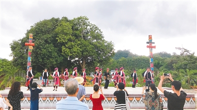 “七个一”特邀作家深入五指山采风,欣赏当地招龙舞表演。王才丰 摄