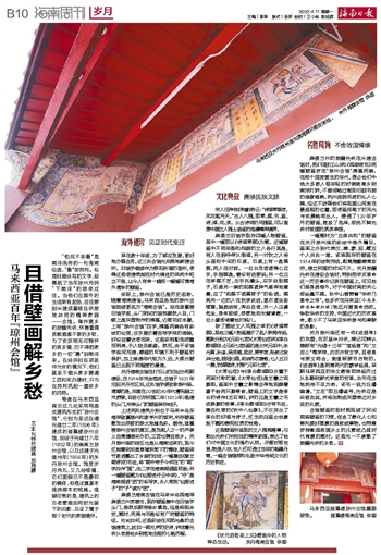 上述两处建筑分别位于马来半岛东海岸登嘉楼州和彭亨州的首府,所存壁画散发出浓郁的琼北地域色彩。据传,登嘉楼琼州会馆的屋瓦,是发起人之一的严崇义自清澜港采办的,工匠也聘自故乡。关丹琼州庙的砖瓦也是从海南运来的,现今还能看到后堂废墟拆卸下的青砖,壁画细节更透露出了乡音的印迹:一幅摘自《滕王阁诗》的书法,将“阁中帝子今何在”的“阁”字刻作“国”,此二字在海南闽语里同音;另一幅壁画题为《仙姬送仔云中来》,“仔”是海南闽语“囝”的俗写字,乡人常把“仙姬送子”的“子”读为“囝”。