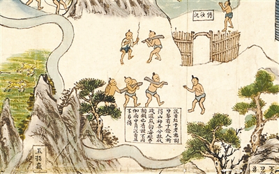 晚清年间绘制的海南岛人文风俗地图(局部)上,对黎人采沉香等生产生活场景的描绘。 陈耿 翻拍