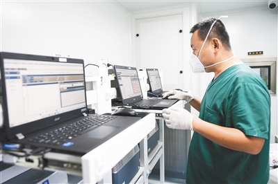 日前,省疾控中心紧急起运集成式自动化核酸检测实验室前往三亚支援核酸检测工作。该集成式自动化核酸检测实验室1班次需要4名技术人员(1人配试剂及准备耗材,2人提取核酸,1人上机监测),一天4个班次。日检测量约5000管(5万人)。图/本报记者 武威 文/本报记者 李艳玫