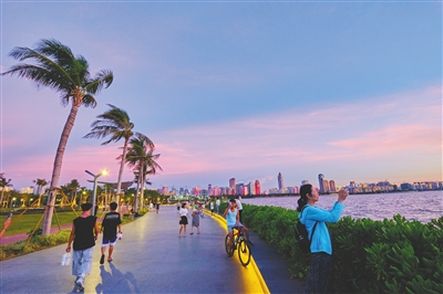 “以前这里没有路灯,海水还充斥着异味,大家都不愿意靠近这一片海域。”对于变化,居住在海口湾外滩附近的居民张小霞深有感触,“如今的海口湾实现蝶变,一路沿着海岸线漫步,饱览美丽的滨海景色,也使得这一片区成为市民游客争相打卡的黄金地段。”在张小霞看来,升级改造后的海口湾汇聚了生态美、人文美、城市美,真正实现了还海、还岸、还景于民。