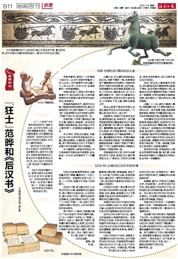 在这篇不到千字的信中,范晔回顾了自己的一生,坦陈自己因为疏狂放肆而终遭杀身之祸,又有大段论及所著的《后汉书》,称其“内容的广博宏富不一定比得上班固的《汉书》;但史料的处理和编纂体例的创新,不一定比之有愧。至于《循吏》以下及《六夷》诸篇序论,更是笔势纵横自如,实在是‘天下之奇作’。”虽命在旦夕,仍不改其“杀身而无悔”的“狂士”本色,后人一般把这封信附于《后汉书》,聊作序言。