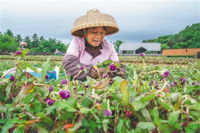 4月18日,在琼海市博鳌镇南强村百亩花海中,农户在进行田间管护。在博鳌亚洲论坛2022年年会举办期间,百亩花海也将进入观赏期,喜迎八方宾客。本报记者 袁琛 摄