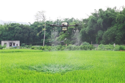 白沙黎族自治县牙叉镇一处田洋,植保无人机在“飞防”作业。据介绍,该无人机1.5小时可完成1000余亩农田的喷施作业。 图/通讯员 彭信翔 文/本报记者 曾毓慧 通讯员 符俏剑