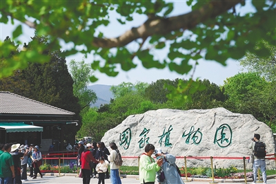 作为国家植物园体系的重要组成部分,国家植物园4月18日在北京正式揭牌,中国生物多样性保护事业再次迈出新步伐。此次设立的国家植物园,是在中国科学院植物研究所(南园)和北京市植物园(北园)现有条件的基础上扩容增效整合而成,总规划面积近600公顷。图为游客在国家植物园入口处参观。新华社记者 鞠焕宗 摄