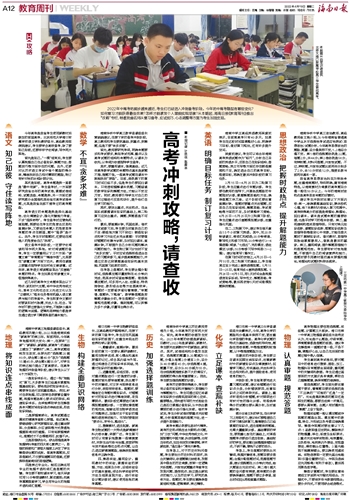 ■ 本报记者 计思佳 陈蔚林2022年中高考的脚步越来越近,考生们已经进入冲刺备考阶段。今年的中高考题型有哪些变化?如何复习才能获得最佳效果?怎样才能激发个人潜能实现逆袭?从本期起,海南日报《教育周刊》推出“攻略”专栏,特邀我省名师从复习备考、应试技巧、心态调整等方面为考生加油支招。