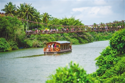 在博鳌九曲生态公园,游客坐船游览观光。本报记者 袁琛 摄