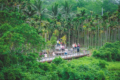 在博鳌九曲生态公园,游客在公园栈道上漫步。 本报记者 袁琛 摄