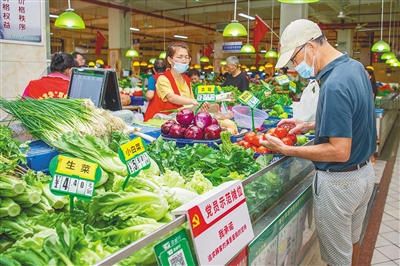 在海口市龙华区文华农贸市场,市民在党员示范摊位上购买蔬菜。本报记者 袁琛 摄