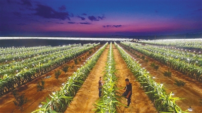 海南金通农业开发有限公司儋州火龙果种植基地夜间补光催花。本报记者 陈元才 摄