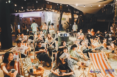 成都市民体验沙滩露天影院。