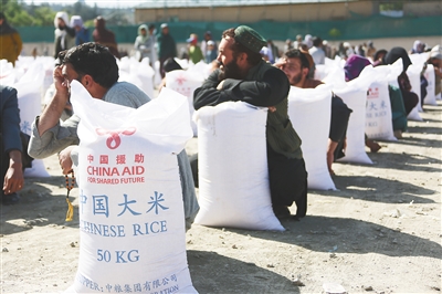 阿富汗临时政府难民事务部23日在首都喀布尔向1500名困难民众分发了中国政府提供的粮食援助。这是于本月初运抵的中国政府对阿富汗人道主义援助的第五批粮食。新华社发
