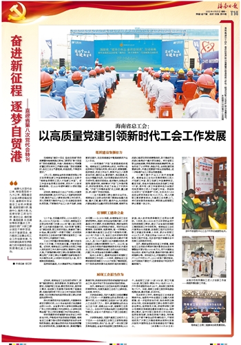 ■ 本报记者 邱江华省第七次党代会以来,特别是党的十九大以来,海南省总工会坚决贯彻落实党中央、省委和中华全国总工会的决策部署,坚持党建引领,围绕中心、服务大局,扎实做好职工政治引领、建功立业、维权服务、基层组建、队伍建设等各项重点工作,团结引领广大职工群众坚定不移听党话、矢志不渝跟党走,奋力推进工运事业和工会工作创新发展,为加快建设具有世界影响力的中国特色自由贸易港扛起工会担当。