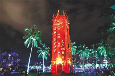 龙华区精心打造的建党百年主题光影秀在长堤路钟楼上演。 本报记者 邱肖帅 摄