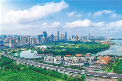 俯瞰海口市龙华区海口湾沿岸风光,远处的楼宇和绿意盎然的海岸,构成了一派生机勃勃的图景。 通讯员 宁远 摄