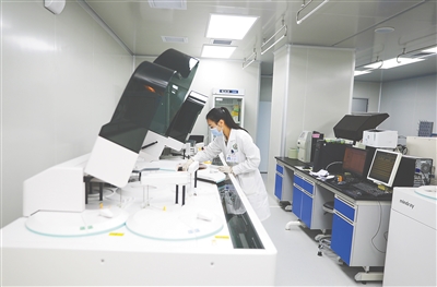 在屯昌县中医医院新院区,工作人员操作生化免疫流水线设备。