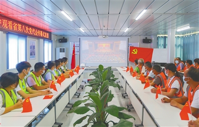 4月26日,海口江东发展大厦项目建设者积极收看省第八次党代会开幕式直播。 见习记者 王程龙 摄