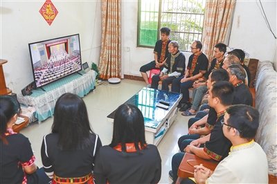 4月26日上午,在五指山市水满乡毛纳村村民黄俐催家的客厅里,村民们和村干部围坐在电视机前,一起收看党代会开幕直播。“党代会报告提到总书记这次来海南考察时,对海南发展给予充分肯定。”黄俐催激动地说。